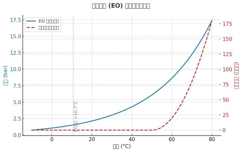 在50 °C以下,EO的饱和蒸汽压增长并不算极端(大约几巴到十几巴的量级),而压力容器通常都配有安全阀,可以在超压时泄放,避免因单纯“气化—升压”导致容器破裂。